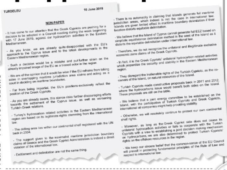 Τουρκικό non paper σε 27 κράτη-μέλη, ζητώντας από το μπλοκ να μην εμπλακεί στο ζήτημα της κυπριακής Αποκλειστικής Οικονομικής Ζώνης.