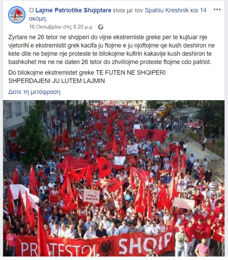 «Στις 26 Οκτωβρίου θα έρθουν στην Αλβανία Έλληνες εξτρεμιστές για το μνημόσυνο του Έλληνα εξτρεμιστή Κατσίφα. Σας καλούμε για μπλόκο στην Κακαβιά. Όποιος θέλει στις 26 Οκτωβρίου Θα γίνει η διαδήλωση. Καλούμε κάθε πατριώτη .