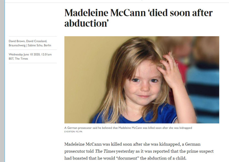 H μικρή Μαντλίν δολοφονήθηκε λίγο μετά την απαγωγή της, είπε στους Times ο Γερμανός εισαγγελέας, που ασχολείται με την υπόθεση της εξαφάνισης της 3χρονης Βρετανίδας πριν 16 χρόνια στο πορτογαλικό θέρετρο Πράια Ντα Ρόχα.