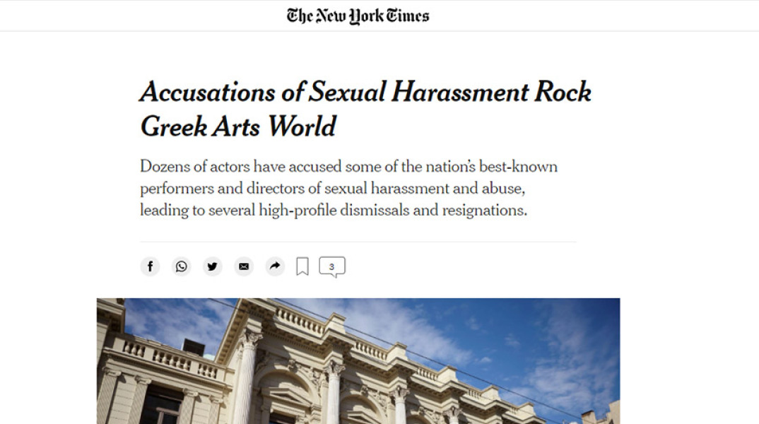 Με τίτλο «Κατηγορίες για σεξουαλική παρενόχληση συνταράσσουν τον ελληνικό καλλιτεχνικό κόσμο», οι «New York Times» φιλοξενούν εκτενές δημοσίευμα στο οποίο αποτυπώνονται όλα όσα είδαμε να διαδραματίζονται το τελευταίο διάστημα στη χώρα μας, μετά την αποκάλυψη της Σοφίας Μπεκατώρου.