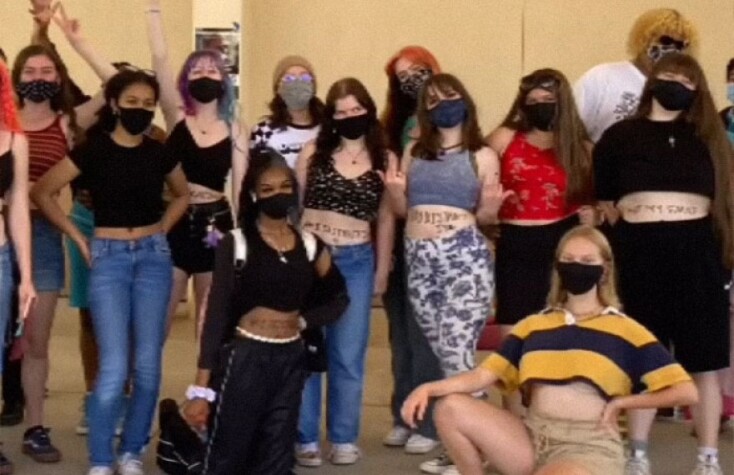 Έφηβα κορίτσια διαμαρτύρονται για τον σεξιστικό ενδυματολογικό κώδικα του σχολείου τους με κοντές μπλούζες και συνθήματα.