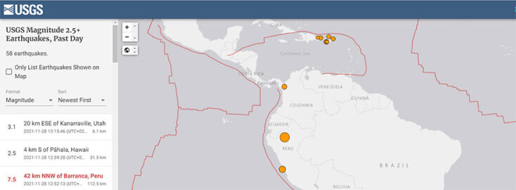Ο σεισμός στο Περού σημειώθηκε στις 12.52 σήμερα Κυριακή 28 Νοεμβρίου 2021, ώρα Ελλάδος. Το βάθος σεισμού μετρήθηκε στα 112,5 χλμ. Ο σεισμός έγινε αισθητός σε πολλές περιοχές της χώρας. Σημειώθηκαν ζημιές σε κτίρια.