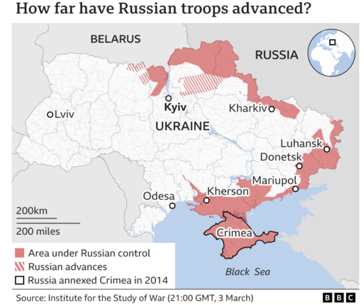 Χάρτης που δείχνει πόσο έχουν εισχωρήσει στα ουκρανικά εδάφη οι ρωσικές δυνάμεις.