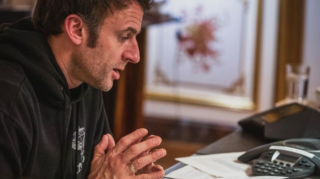 Ο Μακρόν φαίνεται στις φωτογραφίες που δίνονται στη δημοσιότητα τόσο από την επίσημη φωτογράφο του Soazig de la Moissonnière, όσο και από τον λογαριασμό της γαλλικής προεδρίας σκεφτικός, με ένταση στις κινήσεις, να φορά απλά ένα φούτερ.
