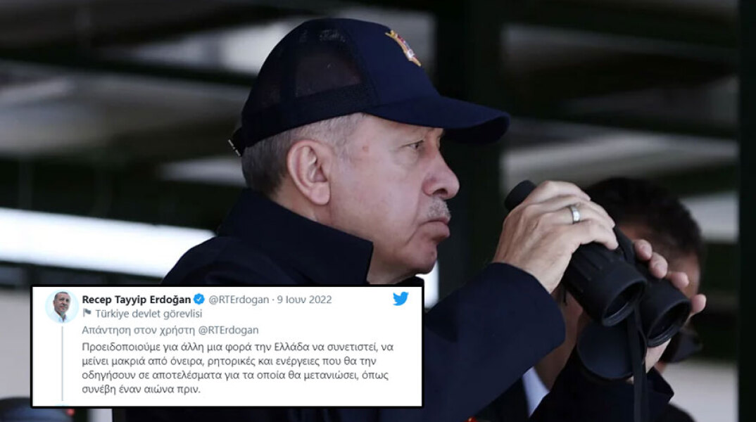 Ο Ερντογάν επανέλαβε τις απειλές που εξαπέλυσε στη στρατιωτική άσκηση EFES 2022, με αναρτήσεις στο Twitter, οι οποίες είναι γραμμένες στα ελληνικά.