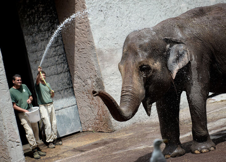 Η δροσιά δεν ήρθε μόνο από το φαγητό. Η Σοφία, ένας ασιατικός ελέφαντας, έκανε κρύα ντους αλλά γνωρίζει από μόνη της και μια ιδιαίτερη τεχνική: κυλιέται στη λάσπη και, με την προβοσκίδα της, καλύπτεται με άμμο και χώμα.