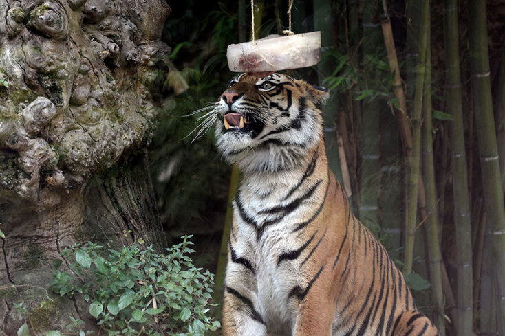 Λίγο πιο πέρα, η Σαμάνθα και ο Μπούμερ, οι δυο ωταρίες του πάρκου, είχαν την ευκαιρία να δοκιμάσουν παγωτό ψάρι, ενώ τα αιλουροειδή, όπως οι τίγρεις, είχαν ριχθεί σε εδέσματα σπάνιας έμπνευσης: Παγωτά με γεύση κρέας ή αίμα.