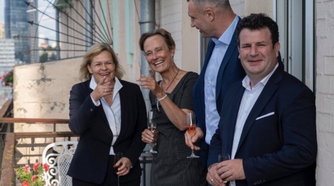 Αντιδράσεις έχει προκαλέσει η φωτογραφία της υπουργού Εσωτερικών της Γερμανίας, Νάνσι Φέζερ, και του υπουργού Εργασίας, Χουμπέρτους Χάιλ, να γελούν κρατώντας ένα ποτήρι με ποτό κατά την πρόσφατη επίσκεψή τους στο Κίεβο.