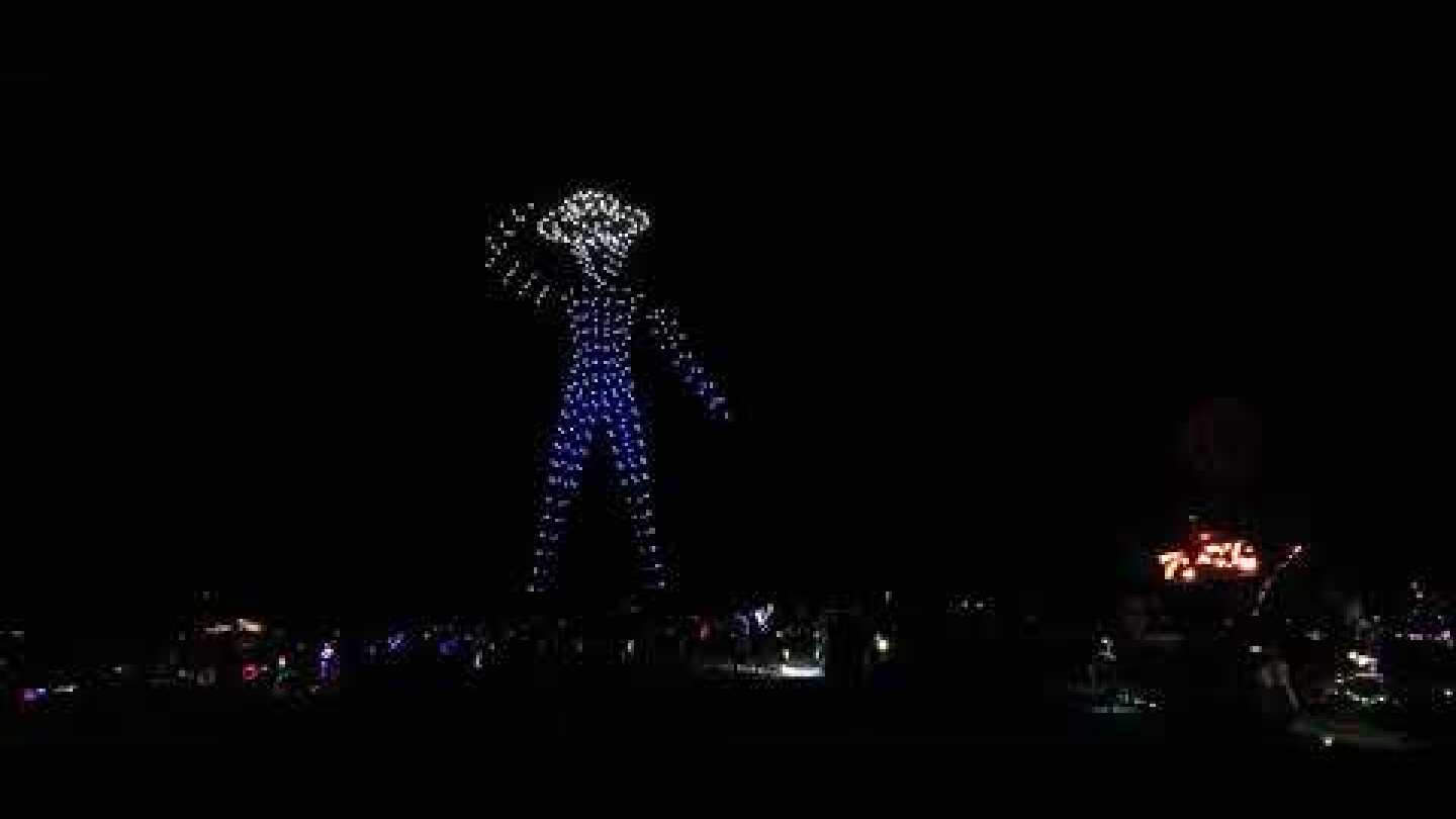 10 μ.μ. - Μετά το εξαντλητικό ταξίδι, το στήσιμο της σκηνής, το ξεφόρτωμα του αυτοκινήτου, το ξεμοντάρισμα των ποδηλάτων που από μόνο του πήρε μία ώρα, κάθομαι στην καρέκλα έξω απ ’τη σκηνή για να ανασάνω. Ένας περαστικός έρχεται και μου πιάνει κουβέντα, όπως συμβαίνει παντού και πάντα εδώ πέρα. Εκεί που μιλάμε, ξαφνικά στον σκοτεινό ουρανό, εκτός οποιασδήποτε λογικής κλίμακας, βλέπω να εμφανίζεται ένας τεράστιος καουμπόϊ που αποτελείται από πολλά φωτεινά σημεία και βγάζει το καπέλο του – κάτι ανάμεσα σε μαζική προσγείωση εξωγήινων και τριπάκι με μανιτάρια. Είναι απλώς χίλια (!) drones που, με ειδικό λογισμικό και προγραμματισμό, εκτελούν ένα φαντασμαγορικό σόου που φαίνεται σε ακτίνα χιλιομέτρων, σχηματίζοντας στον ουρανό τη μορφή του Larry Harvey – του δημιουργού όλης αυτής της ιστορίας που πέθανε πριν τέσσερα χρόνια. Καλώς ήρθαμε στο Burning Man.