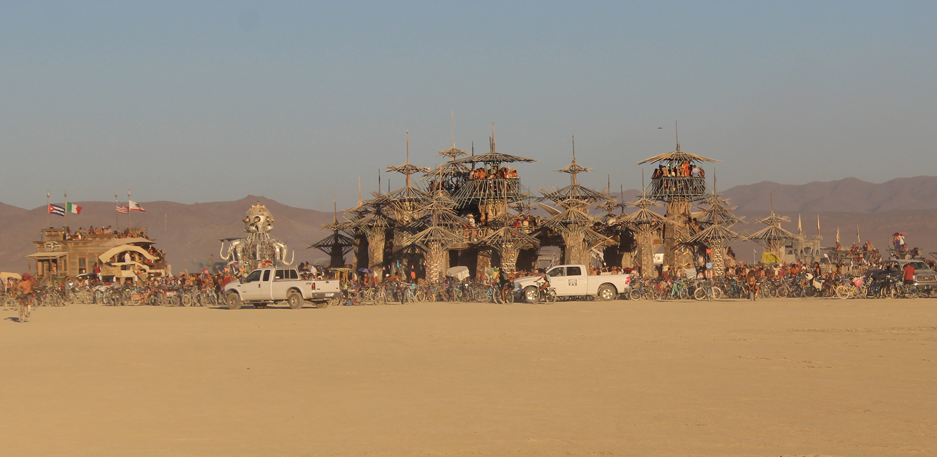 8 μ.μ. - Το φως έχει μόλις πέσει, η πόλη μπαίνει στους ρυθμούς της νύχτας κι εγώ παίρνω το ποδήλατο για να πάω μέχρι την playa, εκεί που τελειώνει η πόλη και ξεκινάει η έρημος και τα έργα τέχνης. Θυμάμαι ακόμη ακριβώς τη στιγμή που είδα για πρώτη φορά την playa βράδυ. Δεν είναι μια εικόνα που μπορείς να την ξεχάσεις, κυρίως επειδή δεν είναι μια εικόνα που εμπίπτει στο πλαίσιο εμπειριών που έχουμε στη Γη. Σε έναν σκοτεινό ορίζοντα, στο άπειρο της ερήμου, χιλιάδες άνθρωποι με τα ποδήλατά τους, στολισμένοι απ’ το κεφάλι μέχρι τις ρόδες με πολύχρωμα LED φωτάκια όλων των ειδών, κινούνται προς όλες τις κατευθύνσεις, ενώ στο βάθος τεράστια έργα τέχνης και φωτιστικές εγκαταστάσεις με λέιζερ και προβολείς οριοθετούν το τοπίο δημιουργώντας την εικόνα και την ατμόσφαιρα ενός ψυχεδελικού λούνα παρκ. Καλό τριπάκι, χωρίς καν μανιτάρια. Μεγάλες φλόγες ξεπετάγονται από διάφορες φορητές κατασκευές, όπως το θρυλικό El Pulpo Mecanico – ένα αξιολάτρευτο χταπόδι-άρμα που κινείται και βγάζει φωτιά από κάθε πλοκάμι, φωτίζοντας τα πρόσωπα αυτών που βρίσκονται πάνω και τριγύρω του.
