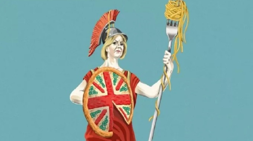 Η Λιζ Τρας, όπως φαίνεται και στο σκίτσο, φοράει περικεφαλαία, κρατάει μια πίτσα για ασπίδα και ένα πιρούνι με μακαρόνια αντί για ακόντιο. Το εβδομαδιαίο έντυπο περιέγραψε τη Βρετανία ως μία χώρα που ταλανίζεται από «την πολιτική αστάθεια και το χαμηλό επίπεδο ανάπτυξης καταλήγοντας υποταγμένη στις αγορές» και θύμισε στους αναγνώστες του ότι το 2012 η Τρας είχε χρησιμοποιήσει την Ιταλία ως παράδειγμα προς αποφυγήν λόγω του «διογκωμένου δημόσιου τομέα, της χαμηλής ανάπτυξης και της χαμηλής παραγωγικότητας» της.