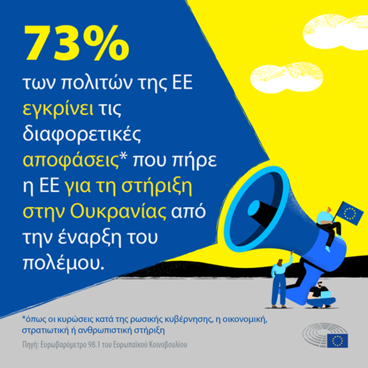 Το 74% των Ευρωπαίων εγκρίνει τη στήριξη που παρέχει η Ευρωπαϊκή Ένωση στην Ουκρανία μετά την εισβολή της Ρωσίας.