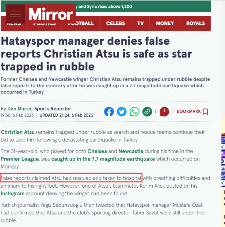 Άρθρο στη βρετανική εφημερίδα «Mirror», επικαλούμενο πηγές από την τουρκική ομάδα, κάνει λόγο για fake news, επισημαίνοντας χαρακτηριστικά ότι «ο Κρίστιαν Ατσού παραμένει στα χαλάσματα».