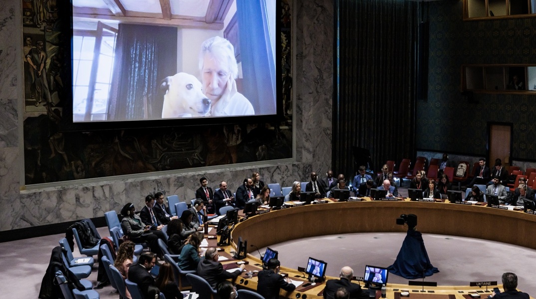 Ο Ρότζερ Γουότερς μίλησε μέσω σύνδεσης βίντεο, ντυμένος με ανοιχτό καφέ τουίντ σακάκι, εμφανιζόμενος σε οθόνη ενώπιον των 15 εθνών στο συμβούλιο που συγκλήθηκε την Τετάρτη για να συζητήσει την κατάσταση στην Ουκρανία.