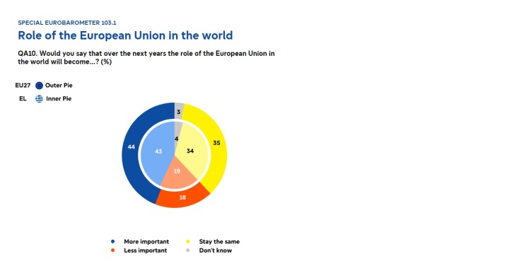 - 75% των Ελλήνων και 83% των Κυπρίων πιστεύει πως η Ένωση πρέπει έχει μεγαλύτερο ρόλο στην προστασία των πολιτών από παγκόσμιες κρίσεις και κινδύνους για την ασφάλεια, αισθητά πάνω από τον μέσο όρο της ΕΕ (66%)