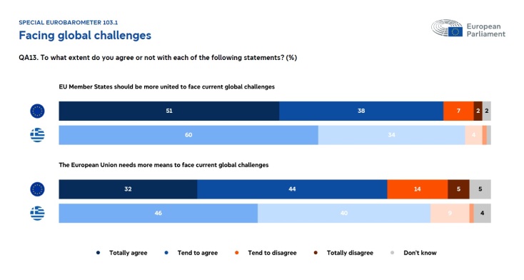 Επιπλέον, σε συντριπτικό ποσοστό οι πολίτες της ΕΕ θεωρούν ότι τα κράτη μέλη θα πρέπει να είναι περισσότερο ενωμένα για να αντιμετωπίσουν τις τρέχουσες παγκόσμιες προκλήσεις (89%) και ότι η Ευρωπαϊκή Ένωση χρειάζεται περισσότερα μέσα για να αντιμετωπίσει μελλοντικές προκλήσεις (76). Ακόμα εντυπωσιακότερα είναι τα ποσοστά σε Ελλάδα και Κύπρο, 94% και 95% αντίστοιχα.