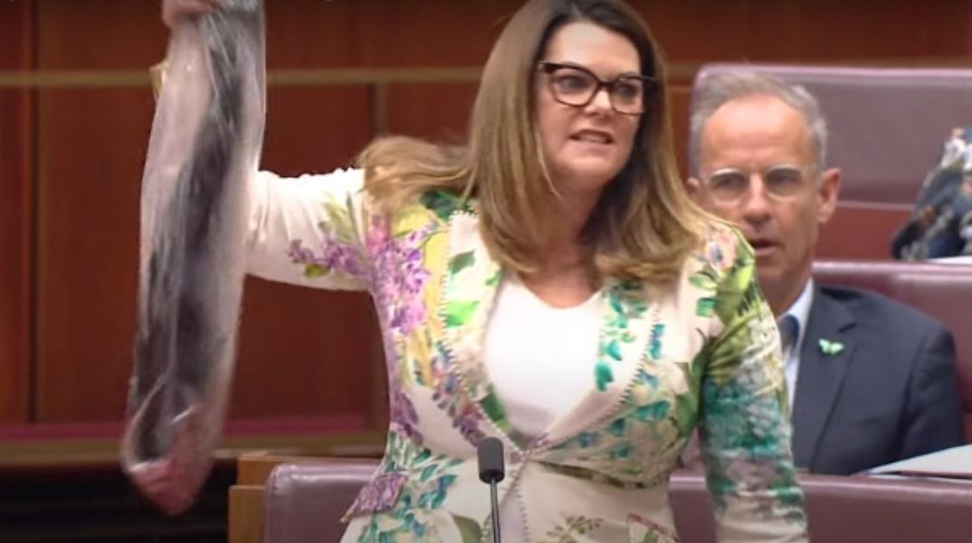 Αυστραλία: Η γερουσιαστής των Πρασίνων, Σάρα Χάνσον-Γιανγκ αποκάλυψε έναν νεκρό σολομό μέσα σε πλαστική σακούλα κατά τη διάρκεια ομιλίας της στο κοινοβούλιο