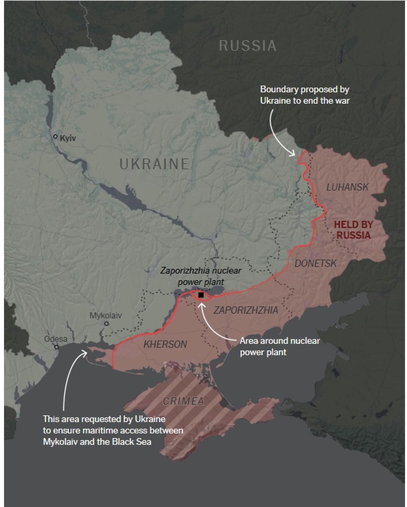 Στη συνέχεια οι συνεργάτες του Τραμπ χάραξαν τις βασικές παραμέτρους μιας πιθανής συμφωνίας: η Ουκρανία θα παραχωρούσε εδάφη κατά μήκος της γραμμής που είχε σχεδιαστεί, θα μπορούσε να ενταχθεί στην Ευρωπαϊκή Ένωση, αλλά η ένταξή της στο ΝΑΤΟ θα «πάγωνε». Ο σταθμός της Ζαπορίζια θα τελούσε υπό αμερικανική ή διεθνή διαχείριση, ενώ οι ΗΠΑ θα ζητούσαν από τη Ρωσία την επιστροφή της Κινμπούρν.