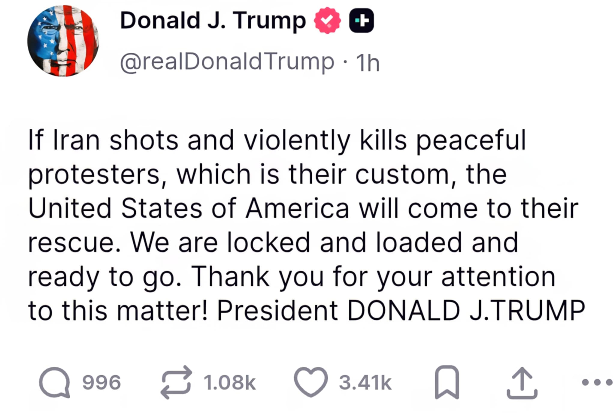 Συγκεκριμένα, ανέφερε: «Αν το Ιράν πυροβολήσει και σκοτώσει βίαια ειρηνικούς διαδηλωτές, κάτι που είναι συνήθειά του, οι Ηνωμένες Πολιτείες Αμερικής θα έρθουν να τους σώσουν. Είμαστε έτοιμοι για δράση και έτοιμοι να ξεκινήσουμε».