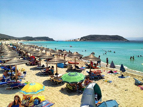 Οι γείτονές μας ήταν μια παρέα αγοριών από τη Λαμία στα αριστερά, ένα ζευγάρι από την Αθήνα στα δεξιά και λίγο πιο δίπλα μια οικογένεια με δύο δίδυμα πανέμορφα κοριτσάκια από τη Σπάρτη. Μας καλωσόρισαν και με την κουβέντα έμαθα ότι κανένας τους δεν ερχόταν για πρώτη φορά. Η οικογένεια πήγαινε 6 χρόνια τώρα, πριν ακόμα αποκτήσει τα κορίτσια, τα αγόρια πέρναγαν το τρίτο τους καλοκαίρι στο νησί, ενώ το ζευγάρι γνωρίστηκε πριν τέσσερα χρόνια ακριβώς εκεί, στο Simos Camping. Από τότε έρχονται κάθε χρόνο και στήνουν τη σκηνή τους στο ίδιο σημείο. Γνώριζαν όλο το προσωπικό και τους σταθερούς παραθεριστές που επιστρέφουν κάθε χρόνο και κανόνιζαν να ξεκλέβουν πάντα λίγες μέρες άδεια για να έρθουν στο κάμπινγκ. Ρώτησα αν είναι ωραία η παραλία και έβαλαν όλοι μαζί τα γέλια. «Θα δεις» μου είπε η κοπέλα με νόημα και μου εκμυστηρεύτηκε ότι το πρωί είναι η καλύτερη ώρα για να απολαύσουμε τη θάλασσα.