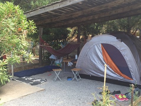 Έπειτα μας έδειξαν τη θέση που είχαμε κλείσει τηλεφωνικά και προσφέρθηκαν να μας βοηθήσουν να στήσουμε τη σκηνή. Αλλά επειδή είμαι ξεροκέφαλη επέμεινα να το κάνω μόνη μου και κάπως έτσι φάγαμε μισή ώρα άσκοπα. Τουλάχιστον τα δέντρα μάς έκαναν σκιά-δροσιά και η παροχή ρεύματος φάνηκε ιδιαίτερα χρήσιμη για το ανεμιστηράκι και το ματάκι για τα κουνούπια τη νύχτα.