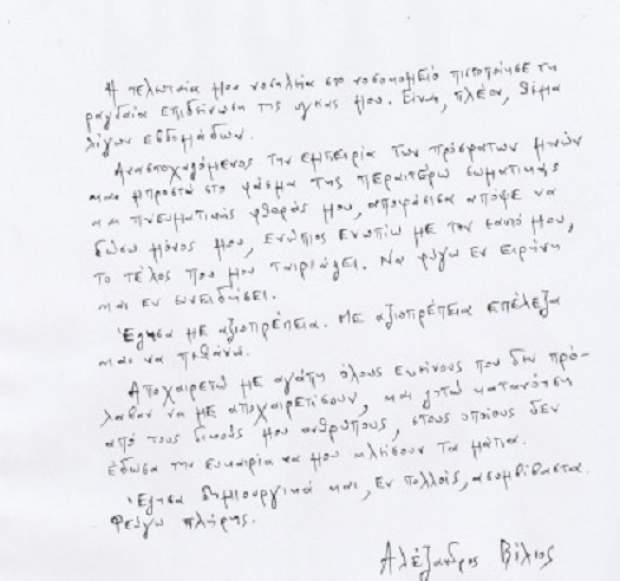 Αναστοχαζόμενος την εμπειρία των πρόσφατων μηνών και μπροστά στο φάσμα της περαιτέρω σωματικής και πνευματικής φθοράς μου, αποφάσισα απόψε να δώσω μόνος μου, ενώπιος ενωπίω με τον εαυτό μου, το τέλος που μου ταιριάζει. Να προσφύγω στη μη υποβοηθούμενη ευθανασία. Να φύγω εν ειρήνη και εν συνειδήσει.