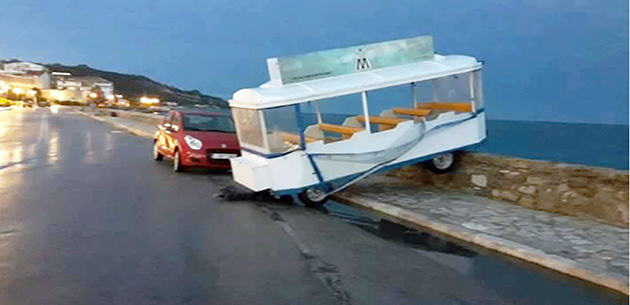 Ζημιές προκλήθηκαν ακόμη και στην πόλη της Ζακύνθου. Από τους δυνατούς μετακινήθηκε ολόκληρο βαγόνι από τρενάκι που κάνει τον γύρο της πόλης.