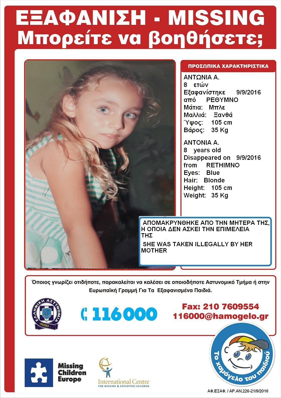 Στις 9 Σεπτεμβρίου 2016 και ώρα 12.00, απομακρύνθηκε η Αντωνία Α., 8 ετών από τη μητέρα της, η οποία δεν ασκεί την επιμέλειά της, από την περιοχή Ρουσσοσπίτι Ρεθύμνου.