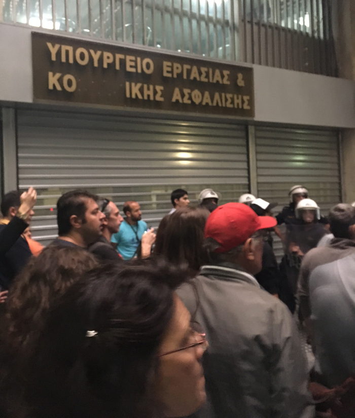 Η ένταση προκλήθηκε καθώς οι συγκεντρωμένοι ζήτησαν μια αντιπροσωπεία τους να μπει στο κτίριο για να συναντήσει τον υπουργό Εργασίας Γιώργο Κατρούγκαλο. Μάλιστα κάποιοι εξ αυτών ξήλωσαν και τμήμα ταμπέλας του υπουργείου.