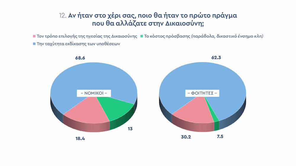 Τέλος, ενδιαφέρον παρουσιάζει πως το 68,5% των νομικών και το 62,3% των φοιτητών το πρώτο πράγμα που θα άλλαζαν στη Δικαιοσύνη είναι η ταχύτητα στην εκδίκαση των υποθέσεων.