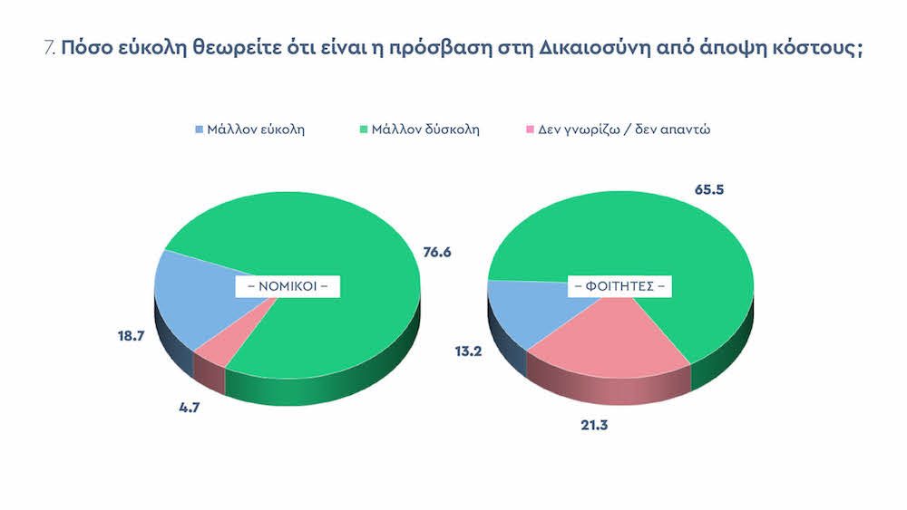 Προβληματισμό πρέπει να προκαλέσει και το γεγονός πως το 76,6% των νομικών και το 65,5% των φοιτητών θεωρούν πολύ ακριβή την πρόσβαση στη Δικαιοσύνη για τους πολίτες.