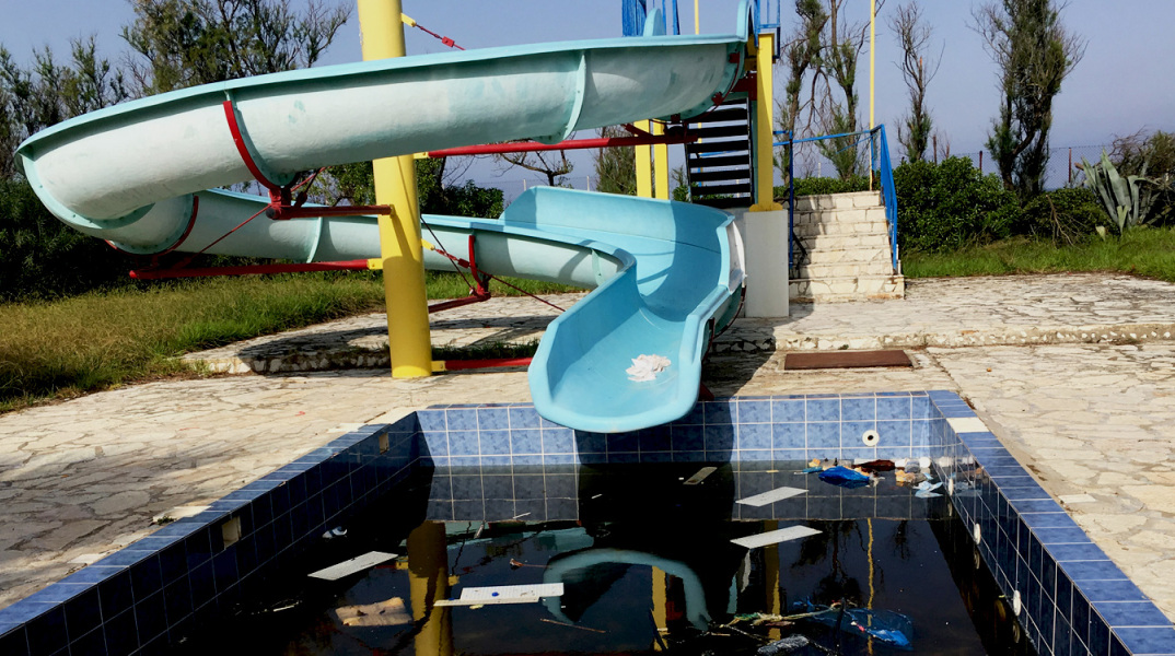 Τα προσφυγόπουλα με φώναξαν με ενθουσιασμό στην πάντα αφύλαχτη πισίνα, να δω τα βατράχια να χοροπηδάνε μες στα βρώμικα νερά και τα σμήνη των κουνουπιών να χορεύουν από πάνω. Δεν διάβασε φαίνεται κανείς τα προληπτικά μέτρα του Ιατρικού Συλλόγου για την ελονοσία. Πόρτα για την παραλία εξακολουθεί να μην υπάρχει, αλλά ευτυχώς είναι ακόμα ανοιχτό το κοντινό beach bar και ο ιδιοκτήτης ειδοποιεί όταν βλέπει περιπλανώμενα νήπια στην παραλία!