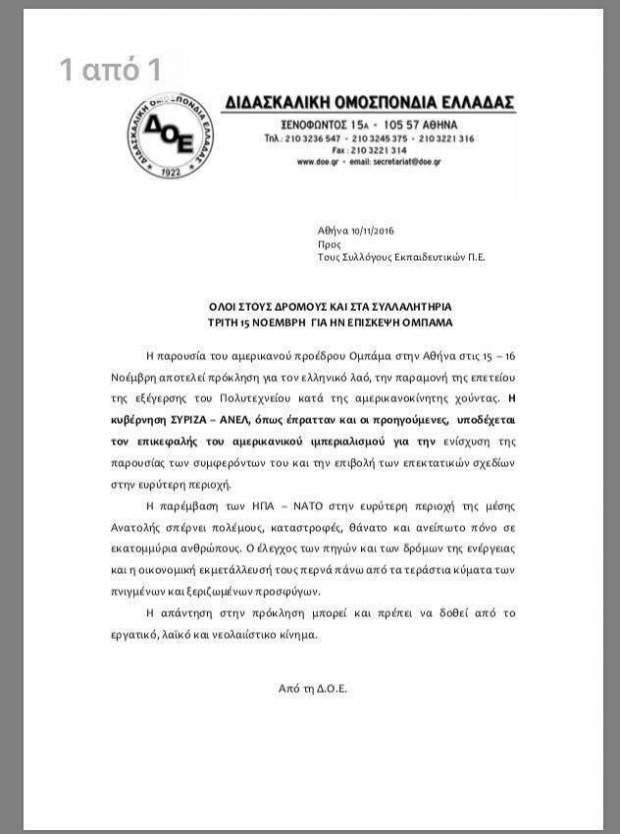 Διαβάστε το κάλεσμα της Διδασκαλικής Ομοσπονδίας κατά του «ιμπεριαλιστή Ομπάμα» (εικόνα)