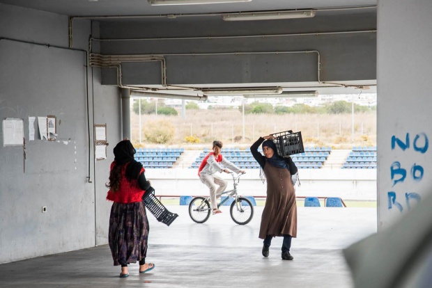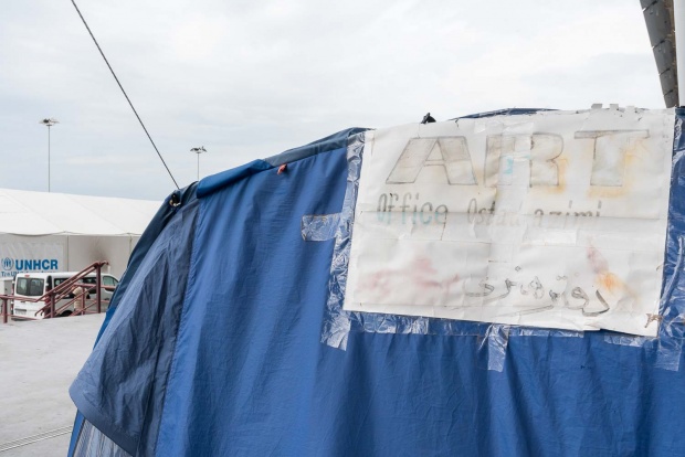 Ήταν από τις ημέρες που ο καιρός είχε αρχίσει να αλλάζει κι έκανε ψύχρα αλλά όλοι κυκλοφορούσαν με τις σαγιονάρες. Είχαμε ραντεβού στις αφίξεις με την Ασπασία Κάκαρη, υπεύθυνη Επικοινωνίας των Γιατρών Χωρίς Σύνορα (MSF), οι οποίοι λειτουργούν εδώ μονάδες Ψυχολογικής Υποστήριξης, Σεξουαλικής Αναπαραγωγής Υγείας και Αγωγής Υγείας, και με τον πολιτιστικό διαμεσολαβητή, τον Μοχάμεντ Μιρζάι, ο οποίος είναι Αφγανός και ζει στην Ελλάδα 10 χρόνια. Ο Μοχάμεντ γνωριζόταν με τους περισσότερους και μας ξενάγησε, πρώτα στις αφίξεις. Οι τουαλέτες είναι χωριστές, ανδρών και γυναικών, όμως οι πόρτες δεν ασφαλίζουν. Αν σε κάποια τετραγωνικά τύχει να ζουν μαζεμένες οικογένειες ο χώρος είναι πολύ πιο καθαρός. Είναι δύσκολο, αλλά προσπαθούν να αυτοοργανωθούν. Εκτός από τον καθαρισμό, κάποιοι κάνουν μαθήματα σε άλλους. Είτε στη γλώσσα τους, γραφή και ανάγνωση, είτε αγγλικών. Ένα άνοιγμα στο χώρο με ένα χαλί κάτω είναι ο τόπος προσευχής. Κι ένα χαρτί προσδιόριζε ποιες ώρες θα προσεύχονται οι σιίτες και πότε οι σουνίτες. Οι σιίτες προσεύχονται τρεις φορές την ημέρα και οι σουνίτες πέντε. «Εσείς μας λέτε όλους μουσουλμάνους, αλλά είναι πολύ γενικό. Όπως οι χριστιανοί είναι ορθόδοξοι, καθολικοί, προτεστάντες κ.λπ., έτσι είμαστε κι εμείς σιίτες και σουνίτες» λέει ο Μοχάμεντ.