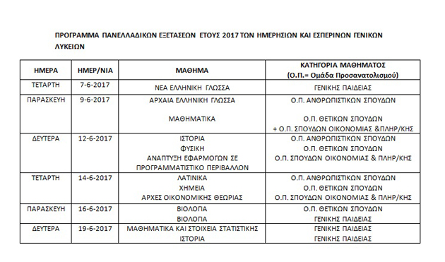 Δείτε το πρόγραμμα των πανελλαδικών εξετάσεων 2017