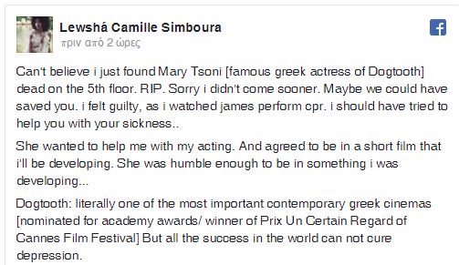 «Δεν μπορώ να πιστέψω ότι βρήκα νεκρή τη Μαίρη Τσώνη (διάσημη Ελληνίδα πρωταγωνίστρια του Κυνόδοντα) στον 5ο όροφο. Ας αναπαυθεί εν ειρήνη. Συγγνώμη που δεν ήρθα νωρίτερα. Ίσως να σε είχα σώσει. Ένιωσα ενοχές, ενώ έβλεπα τον Τζέιμς να σου παρέχει τις πρώτες βοήθειες και να σου κάνει μαλάξεις. Έπρεπε να σε βοηθήσω με την αρρώστια σου…
