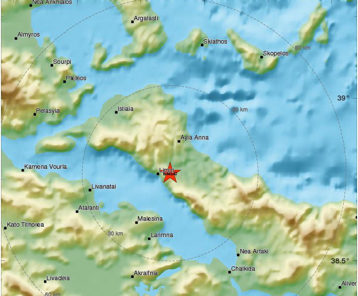 Ειδικότερα, το επίκεντρο του σεισμού εντοπίζεται 10 χιλιόμετρα δυτικά του Μαντουδίου, 31 χιλιόμετρα νοτιοανατολικά της Ιστιαίας και 39 χιλιόμετρα βορειοδυτικά της Χαλκίδας, ενώ το εστιακό του βάθος τοποθετείται μόλις στα 5 χιλιόμετρα.