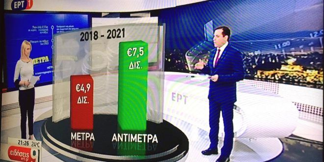Το γράφημα όπως ακριβώς το έστειλε σε non paper το Μέγαρο Μαξίμου υιοθέτησε απόλυτα η ΕΡΤ η οποία στο κεντρικό δελτίο ειδήσεων της Δευτέρας πρόβαλε πως τα μέτρα-καταιγίδα που φέρνει το τέταρτο Μνημόνιο αντιστοιχούν σε 4,9 δισ. ευρώ, ενώ τα αντίμετρα σε 7,5 δισ. ευρώ.