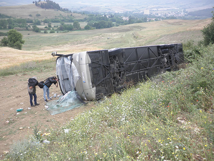 Το ατύχημα σημειώθηκε στο 39ο χλμ. της επαρχιακής οδού Σερρών - Καβάλας, κοντά στον οικισμό Αγγίστα και σύμφωνα με τα όσα ισχυρίστηκε ο οδηγός λεωφορείου, μια νταλίκα πορευόμενη στο αντίθετο ρεύμα του «έκλεισε» το δρόμο, με αποτέλεσμα να φύγει δεξιά, να βγει από το δρόμο και να ανατραπεί.