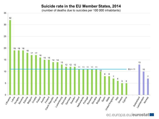 Μάλιστα, όπως επισημαίνει η σελίδα, σύμφωνα με τη EUROSTAT, η χώρα μας βρίσκεται για το 2014 στην τελευταία θέση μαζί με την Κύπρο, με 5 αυτοκτονίες ανά 100.000 κατοίκους (στην ΕΕ των 28 χωρών), με τον μέσο όρο να βρίσκεται στους 11/100.000.
