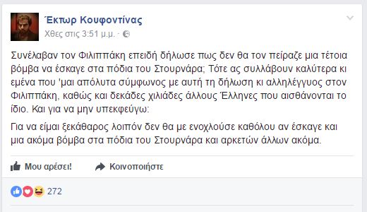 «Συνέλαβαν τον Φιλιππάκη επειδή δήλωσε πως δεν θα τον πείραζε μια τέτοια βόμβα να έσκαγε στα πόδια του Στουρνάρα; Τότε ας συλλάβουν καλύτερα κι εμένα που 'μαι απόλυτα σύμφωνος με αυτή τη δήλωση κι αλληλέγγυος στον Φιλιππάκη, καθώς και δεκάδες χιλιάδες άλλους Έλληνες που αισθάνονται το ίδιο. Και για να μην υπεκφεύγω: Για να είμαι ξεκάθαρος λοιπόν δεν θα με ενοχλούσε καθόλου αν έσκαγε και μια ακόμα βόμβα στα πόδια του Στουρνάρα και αρκετών άλλων ακόμα».