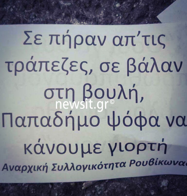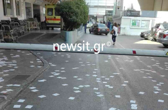 Συγκεκριμένα, πέταξαν φέιγ βολάν έξω από το νοσοκομείο στα οποία αναγράφεται στίχος από το τραγούδι του Μάρκου Βαμβακάρη: «Όσοι γίνουν πρωθυπουργοί όλοι τους να πεθάνουν» και η φράση: «Σε πήραν απ' τις τράπεζες, σε ’βαλαν στη Βουλή, Παπαδήμο ψόφα να κάνουμε γιορτή».