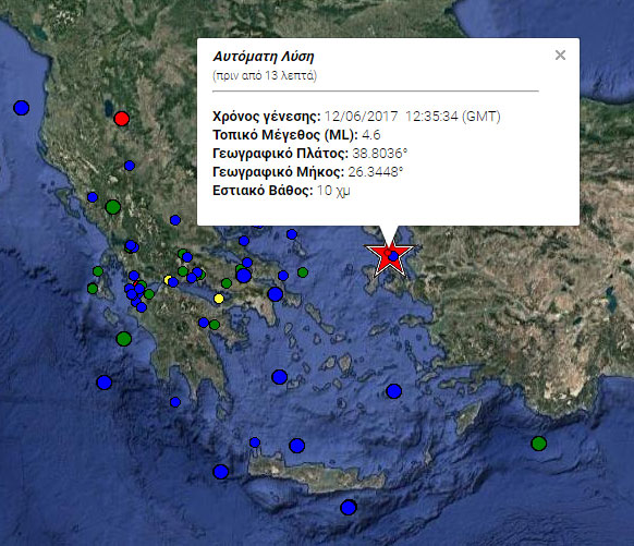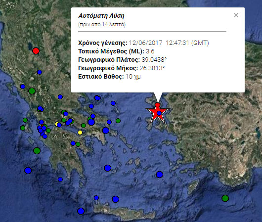 Συγκεκριμένα, το επίκεντρό του εντοπίζεται 36 χιλιόμετρα Νοτιοδυτικά της Μυτιλήνης ενώ το εστιακό του βάθος μόλις στα 10 χλμ.