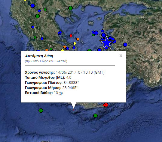 Σεισμική δόνηση μεγέθους 4 βαθμών της κλίμακας Ρίχτερ σημειώθηκε στις 10.10 το πρωί της Τετάρτης στη θαλάσσια περιοχή νότια της Γαύδου, σύμφωνα με την αυτόματη λύση του Γεωδυναμικού Ινστιτούτου του Αστεροσκοπείου Αθηνών.