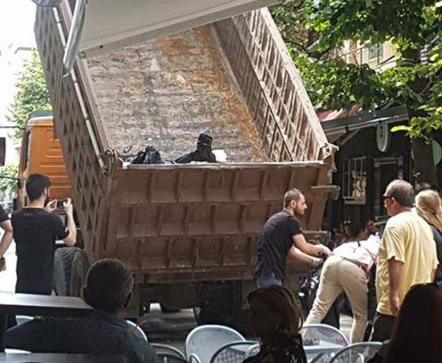 Έτσι, το μεσημέρι της Πέμπτης, έκπληκτοι Λαρισαίοι είδαν ένα φορτηγό να γεμίζει με σακούλες σκουπιδιών, τις οποίες μάζευαν υπάλληλοι καφέ.