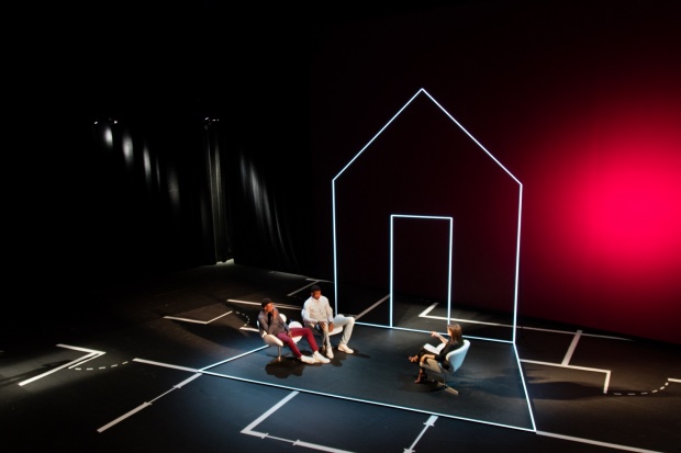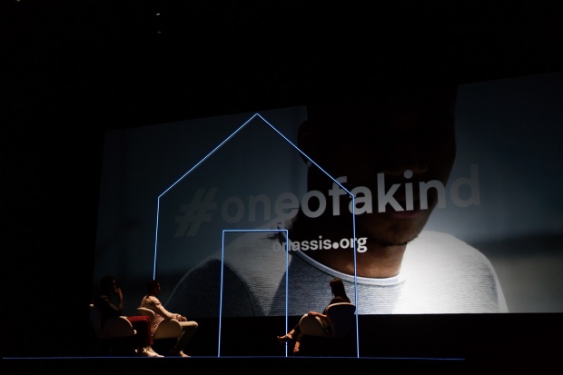 Οι αδερφοί Αντετοκούνμπο και η Αφροδίτη Παναγιωτάκου κάθισαν μπροστά από το εντυπωσιακό σκηνικό που είχε επιμεληθεί η σκηνογράφος και αρχιτέκτονας Εύα Μανιδάκη. Φωτό: Σταύρος Χαμπάκης