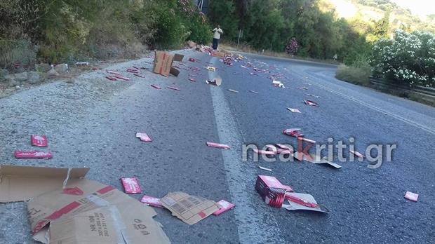 Πάνω από 2.000 λαχταριστές σοκολάτες αμυγδάλου πλημμύρισαν την εθνική οδό Χανίων-Ρεθύμνου στο ύψος του Καλαμίου, όταν άνοιξε η πόρτα του μικρού επαγγελματικού φορτηγού που τις μετέφερε.