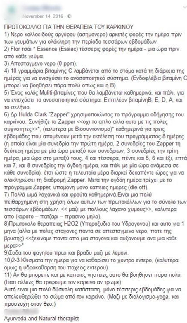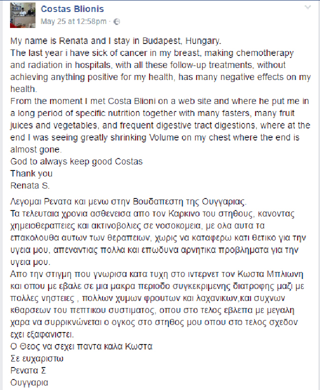 Παραθέτει μάλιστα, μια ακόμη (αναπόδεικτη), περίπτωση γυναίκας που θεραπεύτηκε από καρκίνο του μαστού, ακολουθώντας τις οδηγίες του.