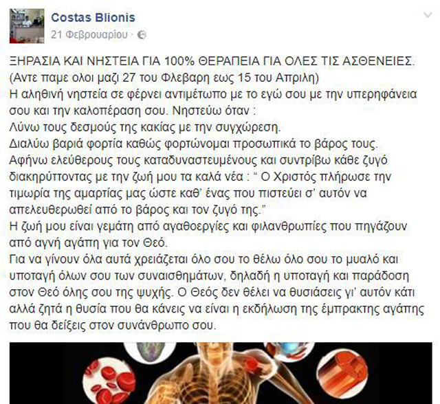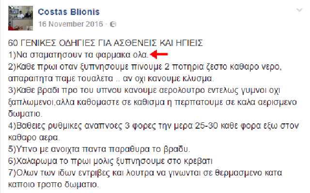 Σύμφωνα με ανάρτηση του κ. Μπλιώνη στο facebook, οι ασθενείς θα πρέπει να σταματήσουν όλα τα φάρμακα και να ακολουθήσουν έναν «οδηγό» 60 βημάτων, για καλή υγεία.