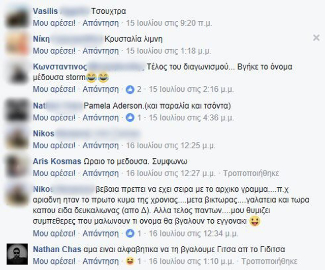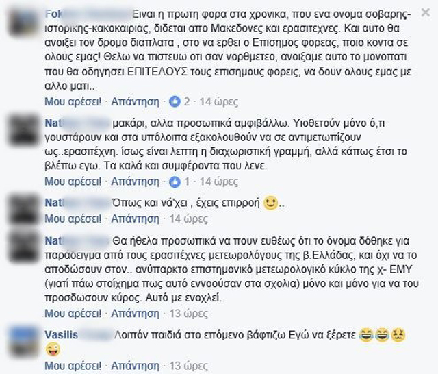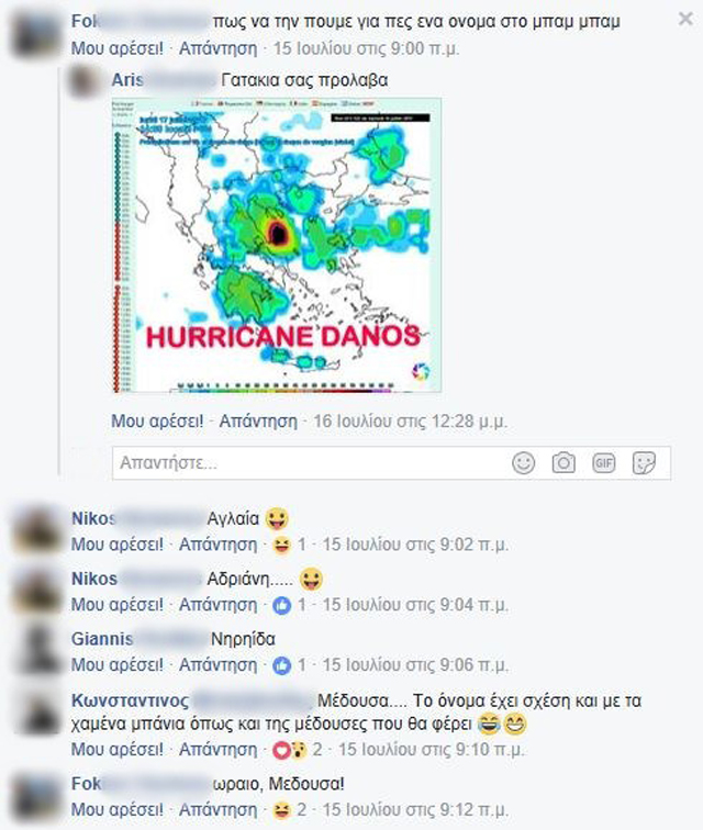 Στην ομάδα του facebook «Ο κακός μας ο καιρός» που απαρτίζεται από χομπίστες «μετερεωλόγους», τα μέλη χιουμοριστικά αποφάσισαν να δώσουν όνομα στο καλοκαιρινό κύμα κακοκαιρίας. Στο «τραπέζι¨της χιουμοριστικής συζήτησης έπεσαν διάφορα ονόματα όπως, ¨Αγλαΐα, Αριάδνη, Νηρηίδα, Τσούχτρα, Κρυσταλία λίμνη και Pamela Aderson».